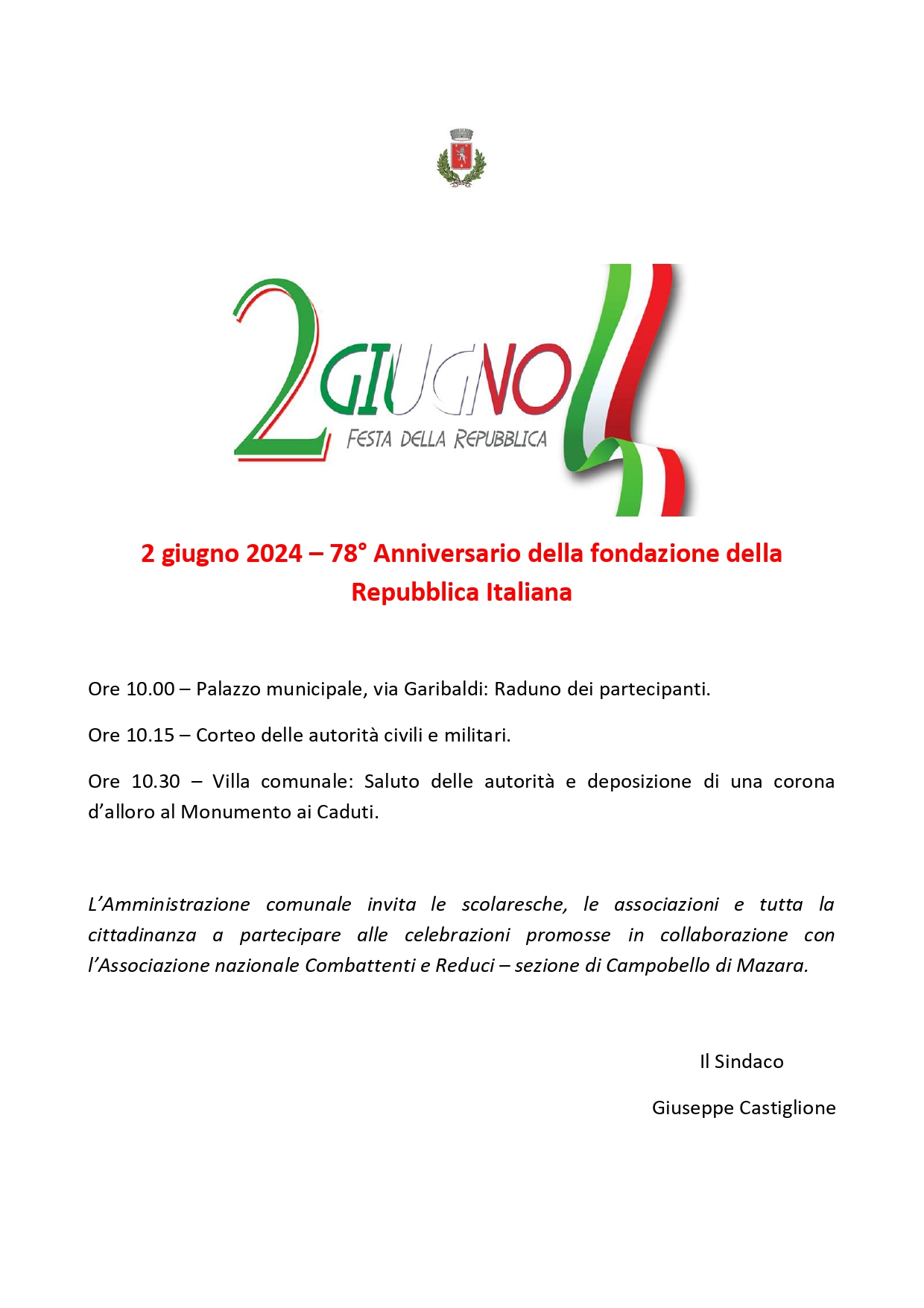 La cittadinanza è invitata a partecipare alla manifestazione promossa in collaborazione con l’Associazione Nazionale Combattenti e Reduci. Anche quest’anno l’Amministrazione comunale, in collaborazione con la locale sezione dell’associazione nazionale Combattenti e Reduci, celebrerà il 2 Giugno, 78° anniversario della nascita della Repubblica Italiana. Come da tradizione, alle ore 10:00, si terrà una sobria cerimonia commemorativa all’interno della villa comunale, dove sarà deposta una corona d’alloro al Monumento ai Caduti.