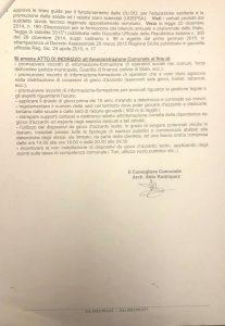 La proposta ha ricevuto il voto favorevole dell'intera Aula. Stessa votazione anche per l'Atto di Indirizzo “Ludopatia” (anche qui allegato) a firma del consigliere Aldo Rodriquez che lo illustrato al Consiglio (con interventi del vicesindaco A. Licari, L. Ingrassia e L. Licari), con il quale si chiede – sostanzialmente – di svolgere attività di prevenzione e informazione sulla pericolosità del gioco d'azzardo, a tutela dei minori in particolare, regolamentando altresì il settore nel rispetto della normativa in materia, tuttora in evoluzione.