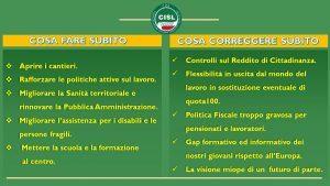 Nel dettaglio, ha aggiunto il segretario generale: “bisogna potenziare il sistema dei controlli sui percettori del Reddito di cittadinanza anche alla luce delle ultime inchieste antimafia, e soprattutto il nuovo governo nazionale deve seriamente pensare a rivedere il sistema che finora è stato solo di natura assistenziale aspetto che, per quanto sia stato fondamentale per molte famiglie in povertà, non ha risolto nulla sul fronte dell’occupazione che è sempre ai minimi storici”. Altro punto da rivedere: “la flessibilità in uscita dal mondo del lavoro, vale a dire o la proroga della quota 100 o altri sistemi altrettanto flessibili per agevolare la pensione e aprire la strada a nuovi posti di lavoro per i giovani”.