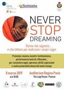 per raccontare sogni, speranze, diritti, aspirazioni e realizzazioni delle donne del nostro tempo. Questo il tema dell'evento “Never Stop Dreaming”, che si terrà domani a Paceco a partire dalle 18 presso l’Auditorium Regina Pacis (Via Luigi Russo). Fra le tante iniziative si terrà la proiezione di un video realizzato nell'ambito progetto “Never Stop Dreaming” che ha coinvolto le donne migranti e gli alunni dell’Istituto comprensivo Giovanni XXIII di Paceco. Il tema è dedicato al Sogno di un mondo migliore, interculturale e paritario.
