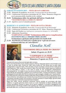 Sabato 10 e domenica 11 Agosto a Mazara del Vallo si festeggia San Lorenzo e Santa Chiara. Sarà presente l'attrice Claudia Koll. Di seguito il programma: SABATO 10 AGOSTO 2019 – FESTA DI SAN LORENZO 19.00 Momento di preghiera: recita della “Coroncina della Divina Misericordia” 19.30 Celebrazione Eucaristica. Presieduta da S.E. Mons. Domenico Mogavero con la presenza delle Autorità civili e militari 20.30 Testimonianza della vita spirituale dell’attrice Claudia Koll “TESIMONI DELLA FEDE IN CRISTO” 21.30 Aperitivo con le comunità presenti DOMENICA 11 AGOSTO 2019 – FESTA DI SANTA CHIARA 18.30 Momento di preghiera: : recita della “Coroncina della Divina Misericordia” 19.30 Celebrazione Eucaristica.