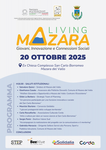 “Living Mazara – sottolinea l’assessore Gianfranco Casale - vuole essere un catalizzatore di cambiamento: un laboratorio di idee e di connessioni sociali dove i giovani potranno ideare, sperimentare e costruire insieme nuovi modi di vivere e valorizzare gli spazi pubblici. L’invito è rivolto a tutta la cittadinanza: partecipare significa contribuire concretamente a immaginare il futuro di Mazara come città giovane, sostenibile e innovativa”.