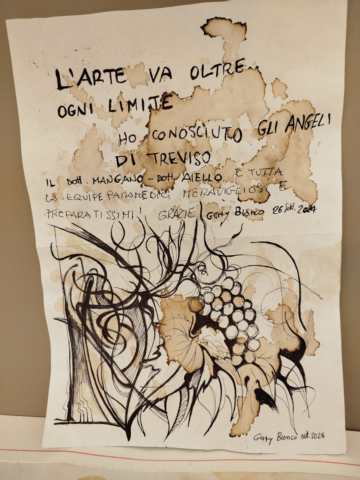 Gerry Bianco, noto artista e architetto mazarese, ha vissuto un'esperienza particolare durante la sua recente degenza presso l'Ospedale Ca' Foncello di Treviso. Anziché lasciarsi sopraffare dal dolore post-operatorio, a seguito di un delicato intervento, l'artista ha trovato nell'arte una potente forma di terapia, trasformando così le sue giornate in ospedale in un'opportunità per esprimere la sua creatività. Bianco ha realizzato ben 12 disegni ad acquerelli, con l'ausilio di materiali semplici. "Ignorando il dolore ho realizzato 12 acquerelli con una tecnica improvvisata sul momento in assenza di strumenti, con penna a biro e acquerellando con il caffè" afferma Bianco.