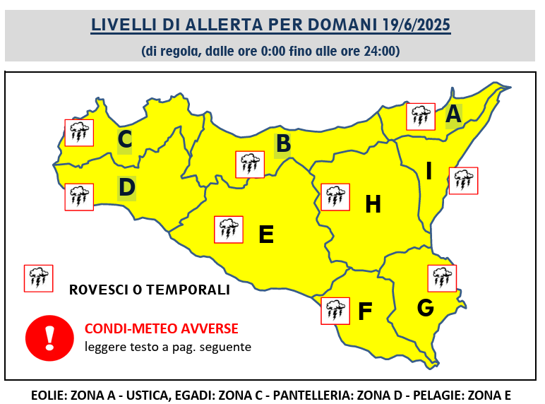 La Protezione Civile Regionale ha diramato un avviso di rischio meteo-idrogeologico e idraulico, valido fino alle 24 di giovedì 19 giugno. Per Palermo, come per tutta la Sicilia, è prevista un’allerta gialla. Il bollettino segnala piogge sparse, principalmente rovesci e temporali, con quantità moderate, soprattutto nelle zone settentrionali e nel sud-est dell’isola.
