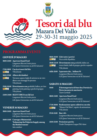 Nell’ambito della rassegna internazionale Tesori dal Blu, Mazara del Vallo ospiterà venerdì 30 maggio 2025, presso la Sala Consiliare del Comune, una prestigiosa Riunione Ministeriale dal titolo “Rafforzare l’approvvigionamento ittico nel Mediterraneo”.