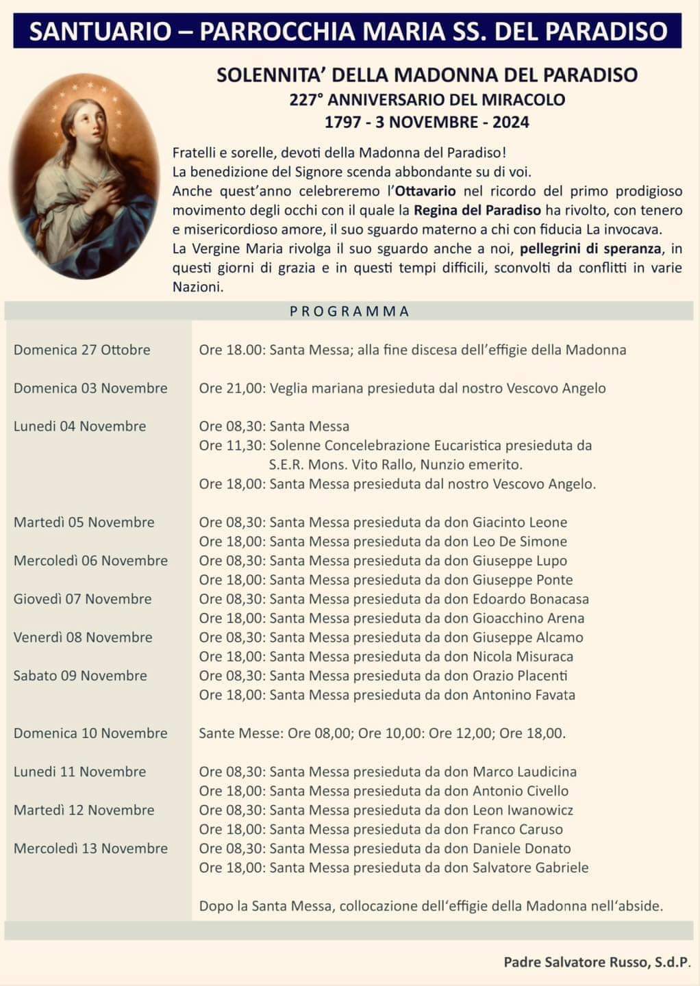 Lunedì 4 novembre, Solennità della Madonna del Paradiso, alle ore 11,30 la solenne concelebrazione eucaristica sarà presieduta dal nunzio apostolico emerito monsignor Vito Rallo e alle ore 18 la santa messa sarà presieduta dal Vescovo Angelo. Mercoledì 13 novembre, al termine della santa messa delle ore 18, l’effigie della Madonna sarà ricollocata nuovamente nell’abside dell'altare maggiore.Comunicato stampa