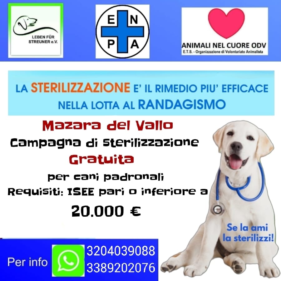 Prosegue la campagna di sterilizzazione gratuita per cani padronali, avviata a Mazara del Vallo dalle associazioni Enpa, Animali nel cuore e Leben für Streuner e.V. La sterilizzazione è un intervento chirurgico semplice e sicuro che previene la riproduzione non controllata, contribuendo così a ridurre il fenomeno del randagismo e a migliorare la salute del proprio animale. La sterilizzazione,infatti, aiuta a prevenire molte malattie. La campagna è rivolta ai possessori di cani che risiedono a Mazara del Vallo e che presentano un ISEE pari o inferiore a 20.000 euro. Per informazioni contattare i numeri presenti sulla locandina (in basso).