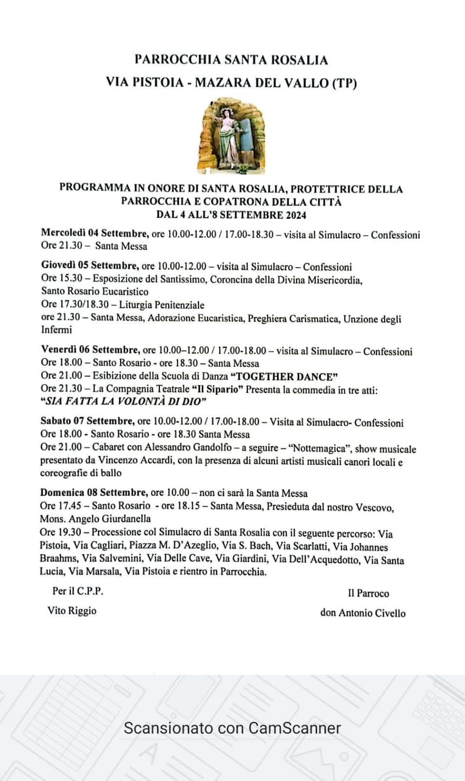 Con il patrocinio del Comune, organizzati dalla Parrocchia di Santa Rosalia, si terranno dal 4 all'8 settembre i festeggiamenti in onore di Santa Rosalia, co-patrona della Città di Mazara del Vallo.