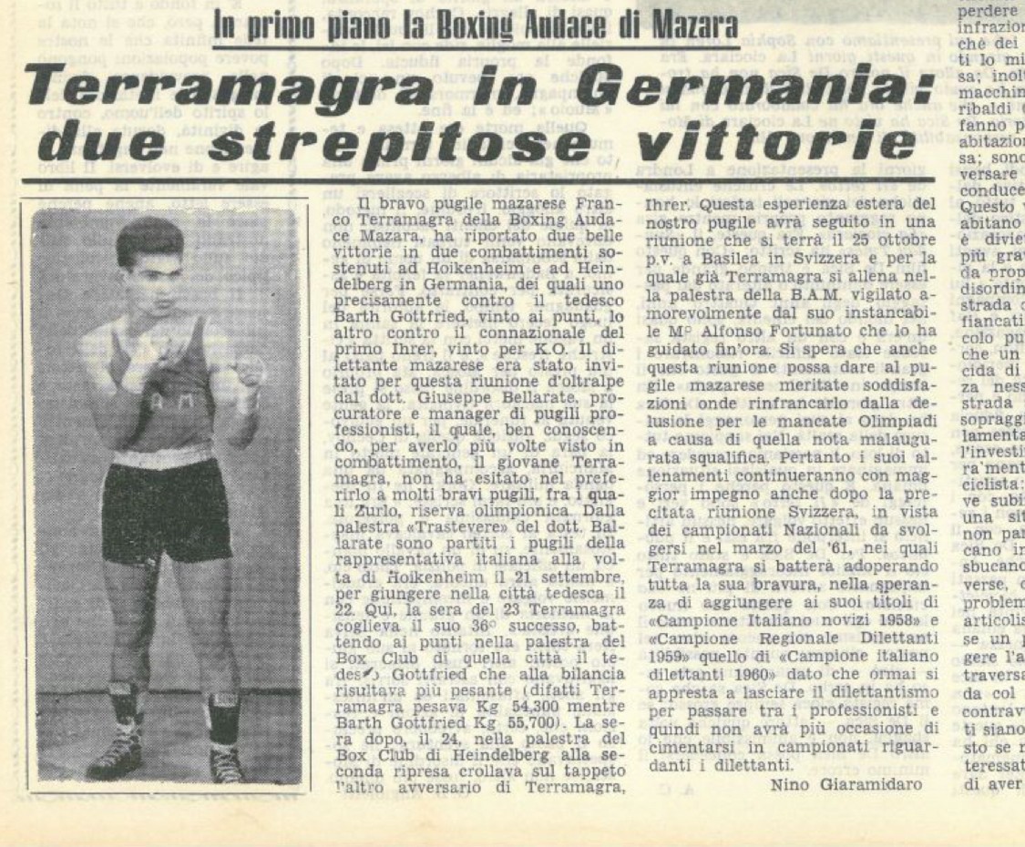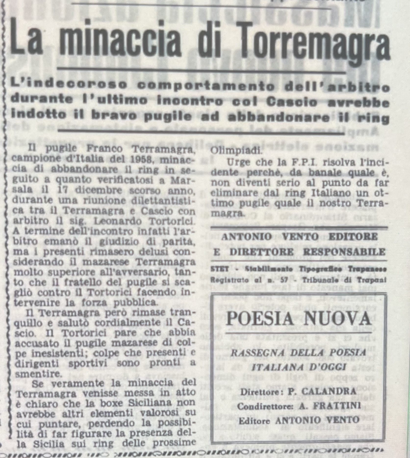 Si è spento nella notte del 12 settembre, a 85 anni, l'ex campione italiano di box Francesco Terramagra. Nato il 29 novembre 1939, Terramagra è stato una figura di spicco nel panorama sportivo locale, conquistando il titolo di campione d'Italia dei pesi gallo nel biennio 1957/1958. Un riconoscimento prestigioso, frutto di un talento e una dedizione straordinari. Membro della prima squadra di boxe di Mazara, Terramagra fu allenato e seguito dal maestro Alfonso Fortunato, costruendo così una carriera straordinaria con circa 110 combattimenti e numerosi premi nazionali e internazionali ottenuti. Oltre che sul ring, Francesco si distingueva nella vita di tutti i giorni.