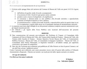 Con ordinanza n. 85 di oggi il Sindaco Salvatore Quinci, quale misura di contrasto alla diffusione del Covid, ha disposto per i giorni 14, 15 e 16 agosto nelle spiagge libere del territorio, i DIVIETI - dell'utilizzo di gazebo, tende, bivacchi, accampamenti; - di accensione di falò e fuochi di ogni genere anche contenuti; - di produrre suoni a mezzo di altoparlanti o di amplificatori; - di consumare e detenere anche su area pubblica cibo, bevande alcoliche e superalcoliche contenute in bottiglie/recipienti in vetro e plastica.