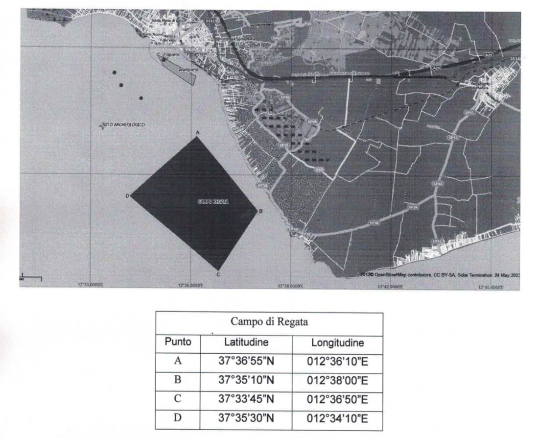 Dalle ore 09.00 alle ore 19.00 dei giorni 01 e 02 giugno 2024, la zona di mare antistante il Lungomare San Vito, del Comune di Mazara del Vallo, sará interessata da una regata velica organizzata dalla Lega Navale Italiana Sezione di Mazara del Vallo, alla quale parteciperanno un massimo di 20 (venti) imbarcazioni a vela altura e monotipo che veleggeranno in un percorso, avente come linea di partenza virtuale delimitata da una barca comitato e da una boa di colore giallo e da altre 4 boe di colore giallo posizionate come appendice A delle istruzioni di regata all'interno dello specchio acqueo meglio rappresentato in figura i cui vertici sono riportati in tabella.