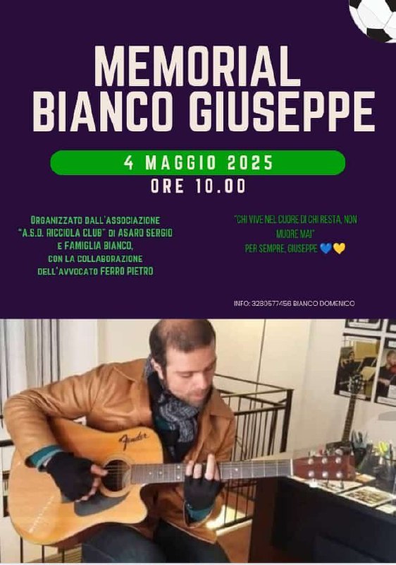 Si ringrazia Sergio Asaro,per la sua disponibilità...e grazie per aver partecipato insieme al tuo bambino e per averci permesso di vivere questa festa all'insegna del gioco sano e divertente.Un grande grazie va "A.S.D. Ricciola club" per l'ospitalità sempre al top,che ha reso possibile questa giornata indimenticabile. Grazie a tutti voi genitori e piccoli campioni per aver reso questo evento un successo straordinario. Ancora grazie! al prossimo anno per la rivincita, sempre nel ricordo di Giuseppe Bianco. Inoltre il prossimo 4 maggio 2025 alle ore 10.00 presso l'ASD Ricciola Club si terrà il memorial Bianco Giuseppe. Maggiori informazioni nella locandina in basso.