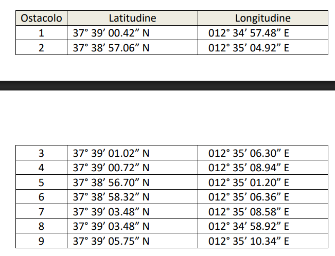 A seguito di rilievi speditivi esperiti - con mezzi in dotazione -, da personale di questa Autorità marittima, è stata constatata la presenza, all’interno dell’”avanporto” e del tratto a valle del “porto canale” di Mazara del Vallo, di diversi ostacoli, presumibilmente riconducibili a natanti sommersi, la cui posizione differisce, probabilmente per avvenuto spostamento nel tempo, da quella a suo tempo resa nota con le ordinanze in premessa richiamate. Pertanto quale utile aggiornamento, ad uso delle unità che, per caratteristiche e abilitazioni, possono ancora utilmente impegnare, nel rispetto delle prescrizioni che seguono, il tratto di porto in questione, ed a tutela della sicurezza della navigazione e dell’ambiente marino, si segnala la presenza di “ostacoli per la navigazione” nei seguenti 9 punti (riferimento DATUM WGS 84):