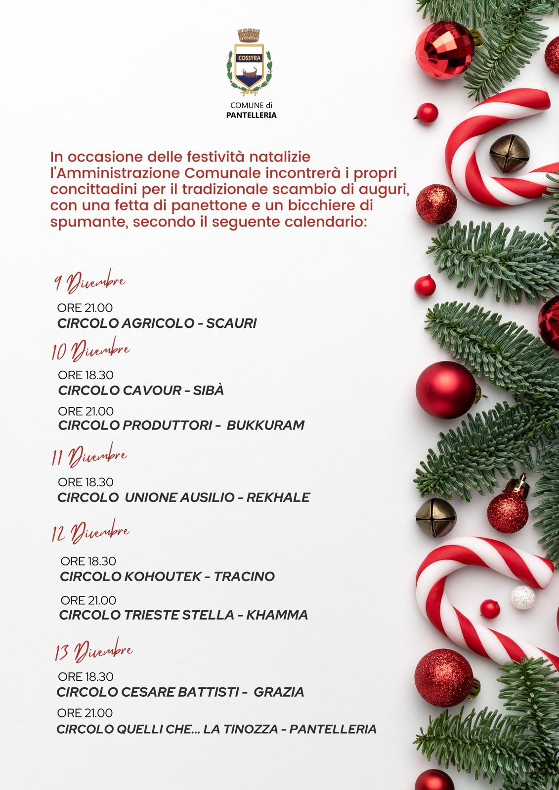 L'Amministrazione Comunale di Pantelleria è lieta di invitarvi agli incontri nei circoli dell'isola per condividere con voi la gioia del Natale e scambiarci gli auguri di buone feste.Tutti i dettagli sono indicati nella locandina.Questi incontri saranno un'occasione speciale per dialogare, confrontarci e brindare insieme al futuro della nostra comunità.Vi aspettiamo numerosi per vivere insieme lo spirito natalizio!