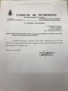 Questa è la risposta alla mia nota del 17/12/2019 dove chiedevo di saper come era la situazione contributiva alla data della mia prima nota e cioè del 03/10/2019, infatti i due consiglieri comunali e l’assessore hanno regolarizzato la loro posizione contributiva solo dopo e grazie alla mia nota del 03/10/2019. Chi amministra una città non deve essere invitato a pagare ma deve essere il primo a farlo, deve essere da esempio per i propri cittadini, ma a Petrosino probabilmente questo non vale.