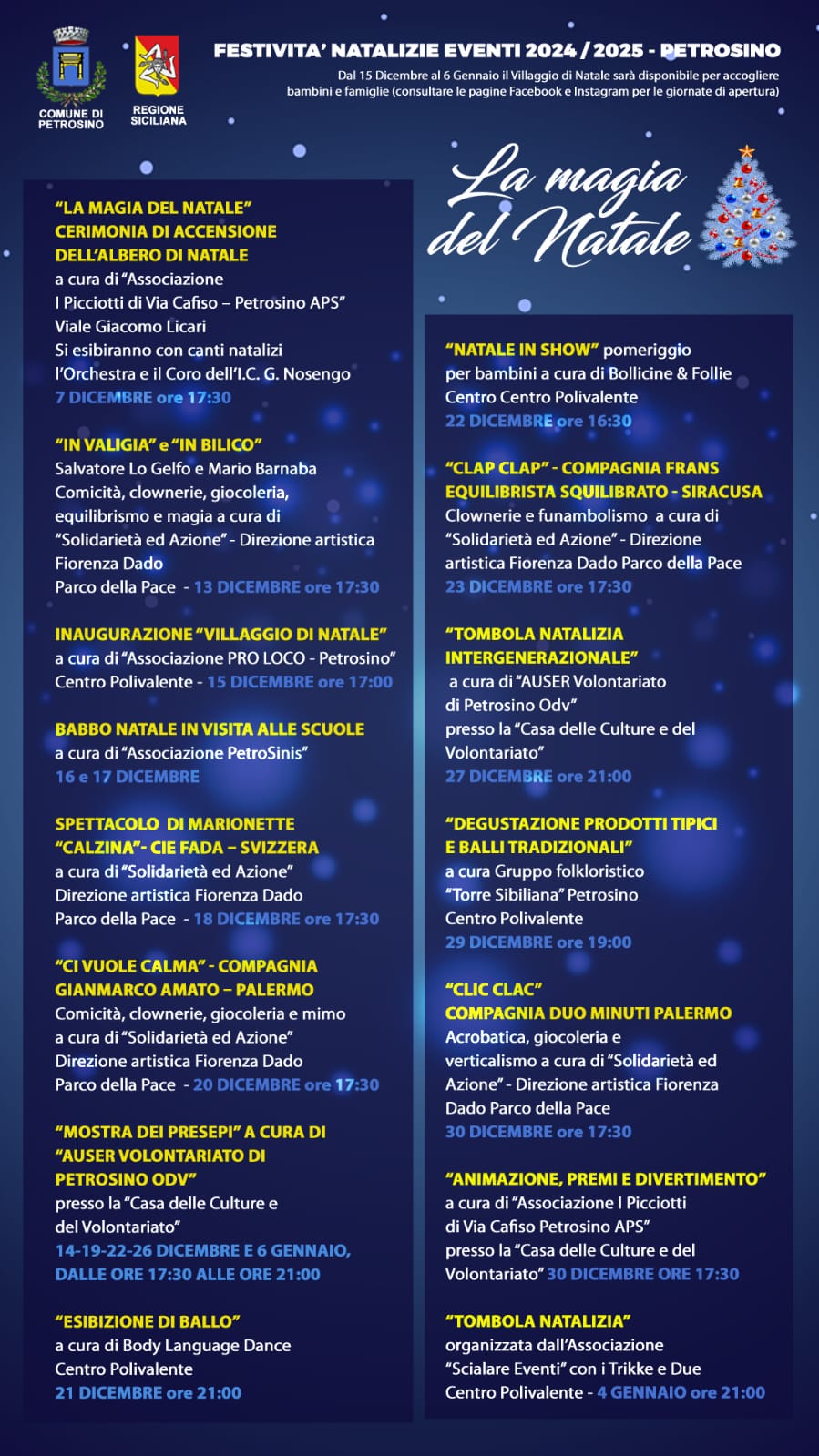 Pronti a celebrare il Natale con un fitto calendario di eventi e attività per tutti i cittadini. L'Amministrazione comunale ha programmato una serie di appuntamenti che si terranno dal 7 dicembre 2024 al 6 gennaio 2025, volta a coinvolgere e divertire grandi e piccini. Tante le iniziative in calendario. Ci saranno laboratori ed eventi, spettacoli teatrali e di clownerie, animazione per tutte le bambine ei bambini di Petrosino e del territorio. Tante le iniziative rivolte alle famiglie sempre con una particolare attenzione agli aspetti intergenerazionali. Tre gli spazi comunali che andranno ad ospitare le diverse iniziative, il Parco della Pace, Il Centro Polivalente e il Centro delle Culture e del Volontariato. “Tante le iniziative in programma con cui vogliamo contribuire ad offrire un Natale felice e sereno a tutta la nostra comunità petrosilena.