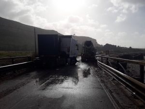 Due i feriti a seguito di un incidente verificatosi nella mattinata di oggi sulla strada provinciale 20 che collega Trapani a Bonagia, nei pressi della Stele di Anchise a Pizzolungo. Come testimoniato dalle immagini, l'impatto è stato violentissimo tra i due mezzi: un autorimorchio, a causa del manto stradale reso viscido per la presenza di acqua marina e alghe, ha cominciato a scivolare fino a schiantarsi contro una betoniera che trasportava calcestruzzo.