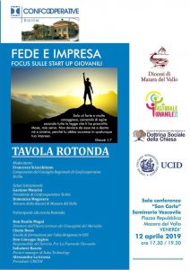 Tavola Rotonda "Fede e impresa – Focus sulle start up giovanili" Moderatore: Francesco Sciacchitano (Componente del Consiglio regionale di Confcooperative Sicilia) Saluti istituzionali: Gaetano Mancini (Presidente di Confcooperative Sicilia) Mons. Domenico Mogavero (Vescovo della diocesi di Mazara del Vallo) Partecipanti alla Tavola Rotonda: Don Danilo Magni Direttore dell’Opera Torinese dei giuseppini del Murialdo) Cinzia Rossi (Scuola di formazione per l’alta dirigenza in Dottrina Sociale della Chiesa) Don Giuseppe Inglese (Responsabile del servizio per la Pastorale Giovanile) Salvatore Bascio (Project Manager di Saba Technology) Alessandro La Grassa (Presidente Centro Ricerche Economiche e Sociali per il Meridione) L’evento è stato organizzato da Confcooperative Sicilia con la collaborazione di Diocesi di Mazara del Vallo; Servizio di Pastorale Giovanile; Scuola di formazione per l’alta dirigenza in Dottrina Sociale della Chiesa e Unione Cristiana Imprenditori e Dirigenti e si terrà venerdi 12 aprile dalle 17.30 alle 19,30 presso la Sala conferenze “San Carlo” del Seminario Vescovile in Piazza della Repubblica a Mazara del Vallo.