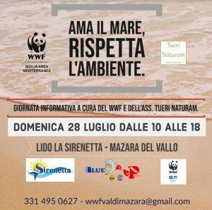 Il WWF Sicilia O.A. Area mediterranea in collaborazione con l'associazione Tueri naturam danno appuntamento per domenica 28 luglio presso il lido la Sirenetta di Mazara del Vallo. Dove dalle ore 10 alle 18 si terra un punto di informazione inerente al progetto tartaruga e si cercherà di sensibilizzare la gente sul problema rifiuti e sul loro smaltimento oltre che a un uso piu consapevole delle materie plastiche. L'occasione vedrà nel pomeriggio, il Blue Deep Diving center di Mazara della divisione WWF Sub, impegnato in alcune attività per i bagnanti tra le quali l'utilizzo delle attrezzature per le immersioni e la prova dei costumi a coda di sirena.